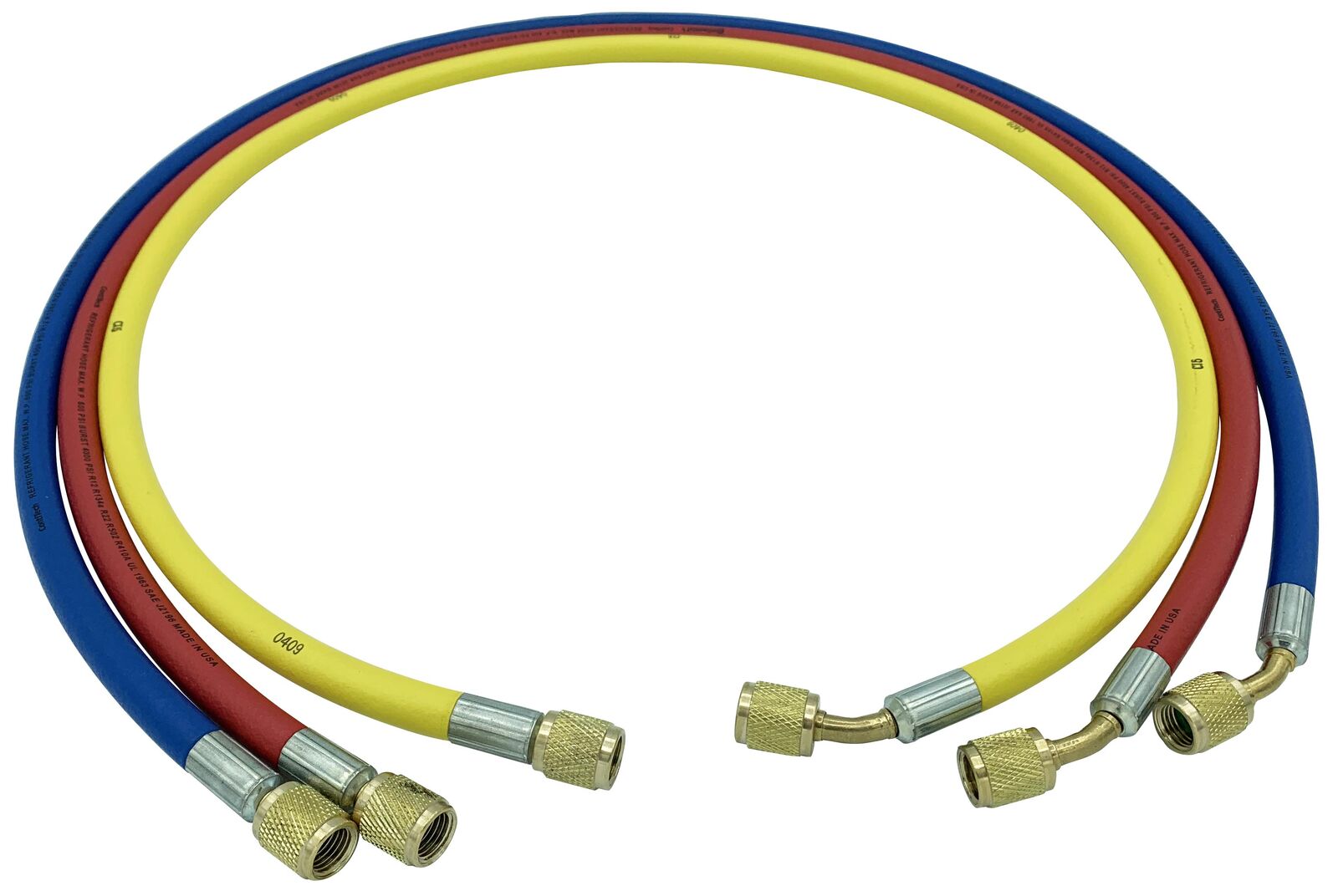 Gamme de flexibles en 3 couleurs (rouge, bleu et jaune) pour connecter les machines et équipements aux systèmes de climatisation automobiles. Angle a 45° sur un seul côté. Existe en plusieurs longueurs.