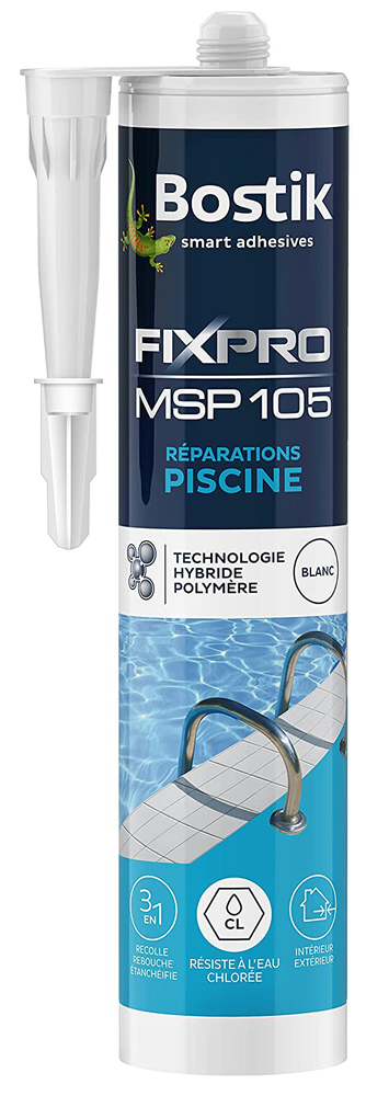 FIXPRO MSP 105 REPAR PISCINE 290ML Mastic hybride polymère, colle et jointe, pour les réparations de piscines. | Haute résistance à l’arrachement. | Prise en 5 secondes. | Résiste à l’eau, même chlorée. | Résiste aux chocs et vibrations. | Résiste aux UV et variations de température de 40°C à 90°C). | Peut se peindre après séchage. | Consommation : env. 15m de cordon d’un diamètre de 5mm