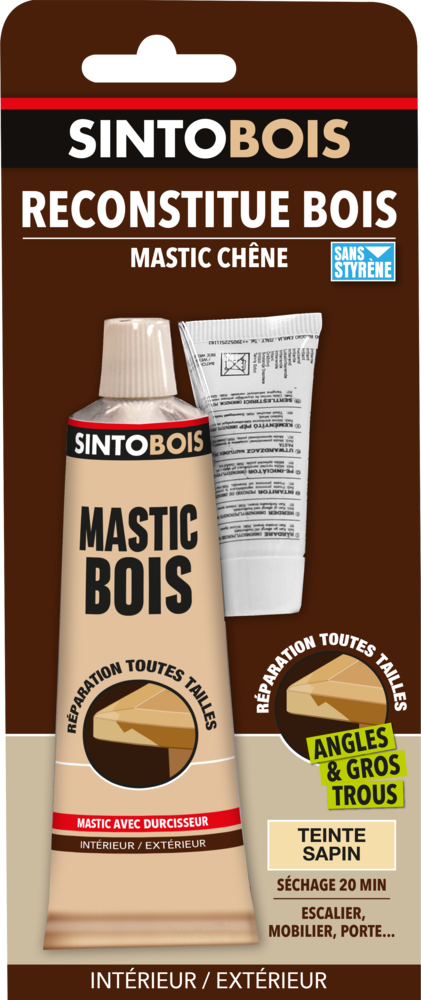 SINTOBOIS RECONSTR SAPIN S/B 66ML Mastic Sintobois teinte Sapin bi-composants souple sans styrène pour réparer, restaurer, reconstituer une partie de bois manquante, boucher, coller le bois et ses dérivés. | Applicable en intérieur et extérieur. | Prise rapide.