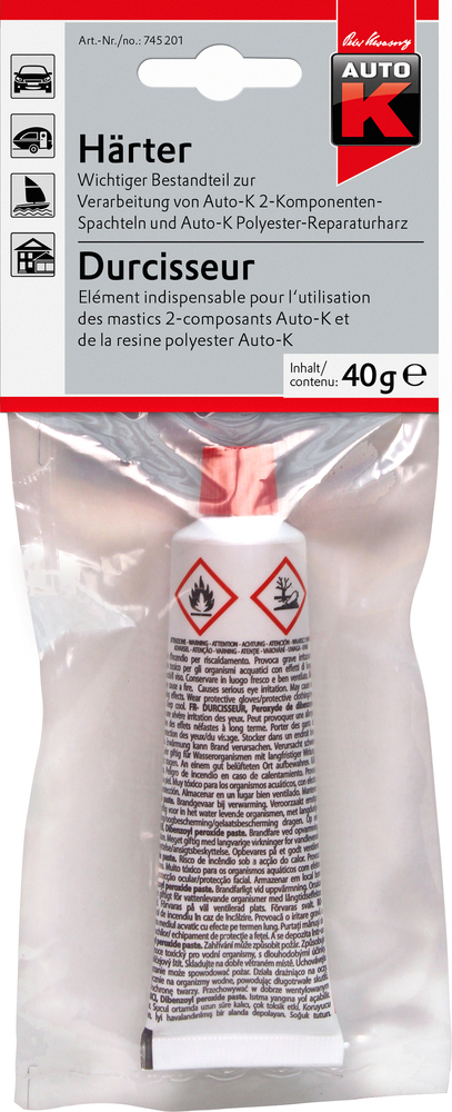 AUTO REPAR 745201 DURCISSEUR Le durcisseur Auto-K est un composant important lors du travail avec la résine de réparation et le mastic. Il est mélangé en proportion avec la résine de réparation ou le mastic. Par ce mélange, le durcissement indispensable de la résine de réparation et du mastic est possible.