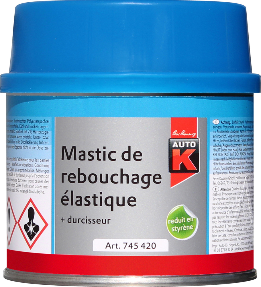 MASTIC 745420 REB ELAST 200 Mélange de mastic polyester et de particules aluminium. | Excellent pour la réparation des surfaces en métal et en plastique comme les pare-chocs ou les portes, utilisable également sur la pierre, le plastique, la céramique ou le béton.