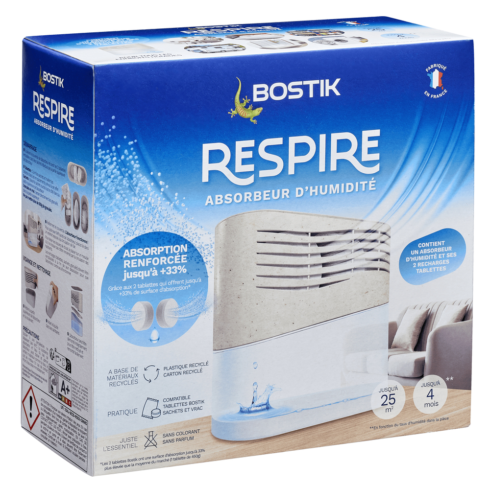 ABSORBEUR HUMIDITE RESPIRE Bostik RESPIRE est un déshumidificateur dair anti condensation, absorbeur dhumidité pour maison, appartement et caravane, pour des pièces jusquà 25m², inclus 2 recharges tablettes sans colorant ni parfum de 250 g.
