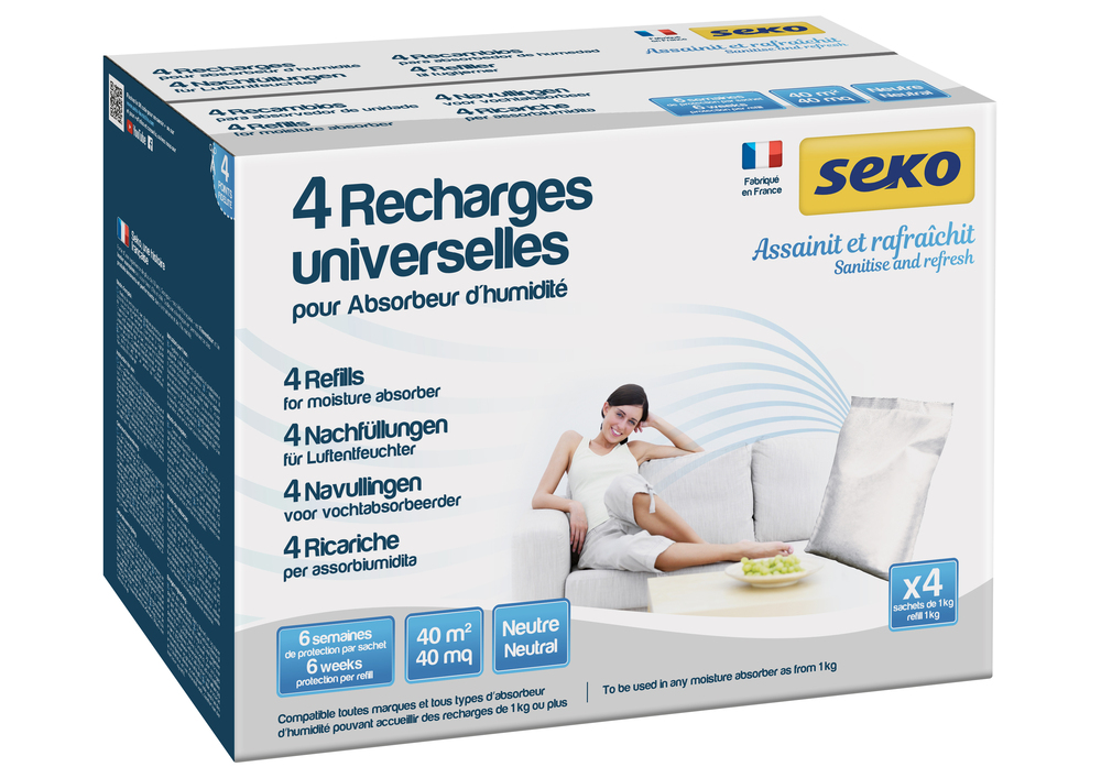 SEKO 4 RECHARGE SS GAINE 1KG Recharge pour absorbeur d’humidité. | Assainit et rafraichit. | Conseillé pour 40m². 6 semaines de protection.