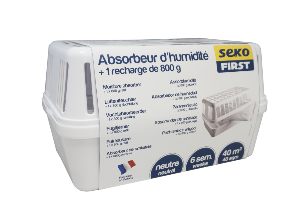 SEKOFIRST ABSORB&RECH 800GR Absorbeur dhumidité rechargeable comprenant 1 recharge sous gaine propreté de 800gr. | Assainit et rafraichit. | Parfum neutre. | Conseillé pour 40m². 6 semaines de protection.