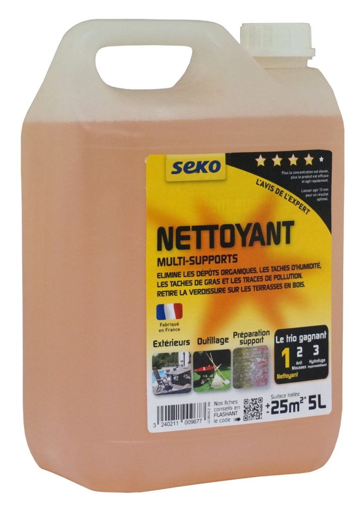 SEKO NETTOYANT MULTI SUPPORTS 5L Solution aqueuse très puissante pour l’extérieur, prêt à l’emploi. | Nettoie en profondeur les surfaces lessivables et ne laisse pas d’incrustation ou de marques sur les surfaces en verres. | Traite jusqu’à 25m² en 20 à 30 minutes minimum.