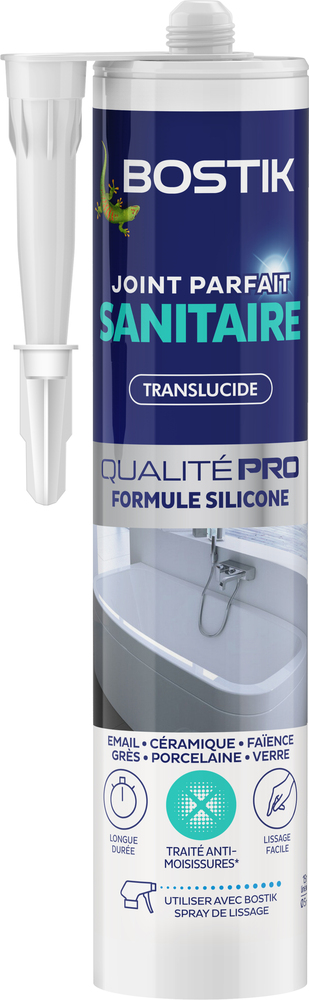 JOINT PARFAIT SANITAIRE 280ML TRANS Mastic d’étanchéité Joint Parfait sanitaire transparent de Bostik, haute performance, qualité pro 100% silicone pour vos joints transparents de contour de sanitaires : douche, vasque, WC, cuisine et raccordements entre meubles et sols/murs.