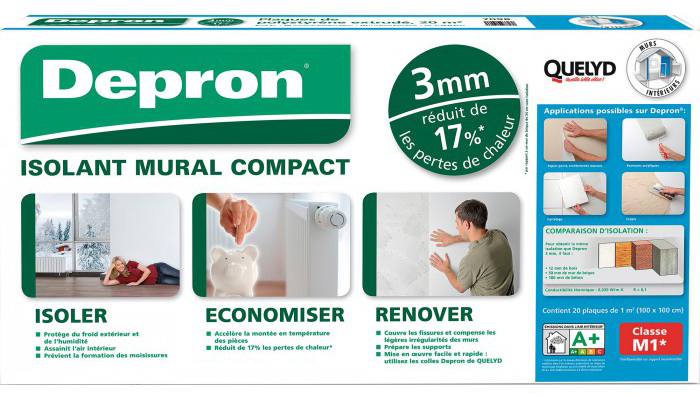 DEPRON Ep.3MM 1M² x20 plaques Isolant Mural Plaque de Polystyrène extrudé 100 x 100 cm. | Contient 20 plaques de 1m², soit 20m² d’isolant au total. | Classe M. 1* | Protège du froid extérieur et de l’humidité. | Assainit l’air intérieur. | Prévient la formation des moisissures. | Accélère la montée en température des pièces. | Réduit de 17% la perte de chaleur. | Couvre les fissures et compense les légères irrégularités des murs.