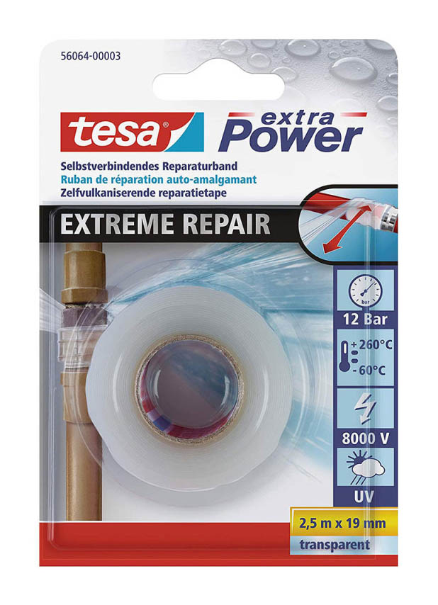 TESA EXTREM REPAIR 2M5X19 TRANSPAR Auto-amalgamant, ce ruban convient pour des réparations rapides et durables sur câbles, tuyaux ou surfaces exposées. | Il permet une étanchéité efficace même sous l’eau grâce à son application directe par superposition sans colle. | Résiste à une pression jusqu’à 12 bars et à des températures extrêmes comprises entre -60 °C et +260 °C. | Assure une isolation électrique jusqu’à 8000 volts, adaptée aux interventions sur câblages électriques. | Supporte les environnements agressifs grâce à une haute résistance aux UV, aux produits chimiques et aux huiles. | Adapté aux réparations permanentes ou temporaires, intérieures comme extérieures. | Se retire sans laisser de résidus, sans endommager les surfaces traitées.