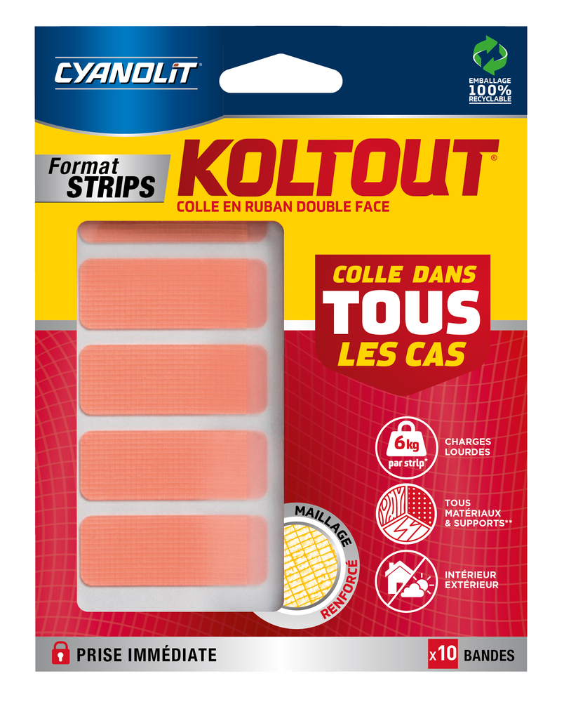 KOLTOUT STRIP PREDECOUPE X10 Colle ruban double face strips prédécoupés. | Ultra renforcée. | Ultra puissant jusqu’à 6kg par strip. | Prise immédiate. | Tous matériaux, toutes surfaces. | Intérieur/Extérieur.
