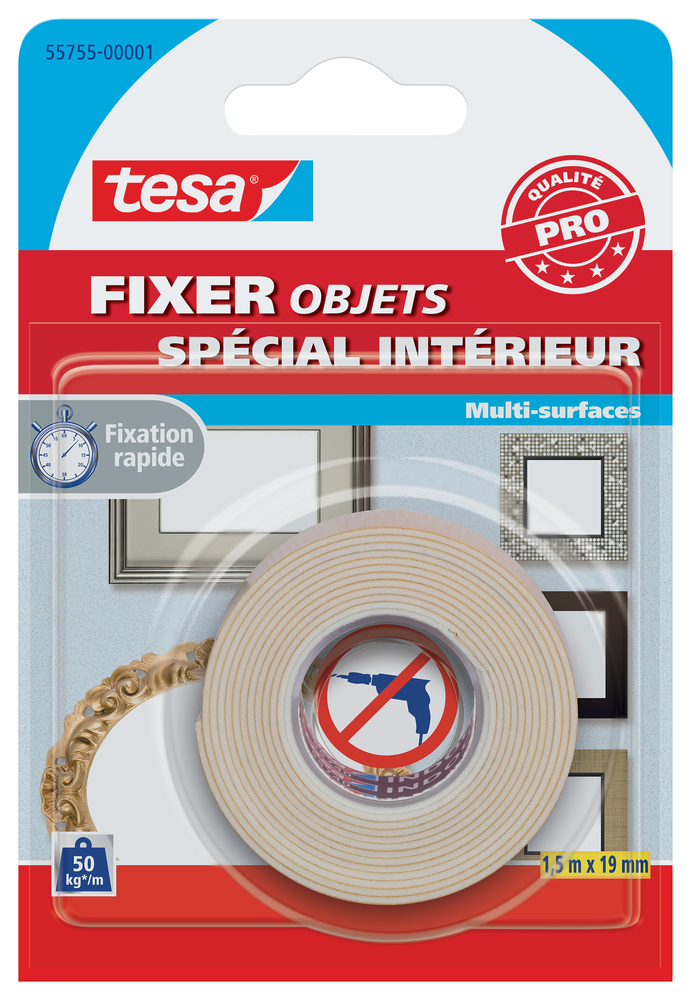 TESA FIXER DBL F INTER 1,5X19 Adhésif de fixation double-face robuste pour une grande variété dapplications à la maison, particulièrement pour fixer de petits objets à lintérieur.