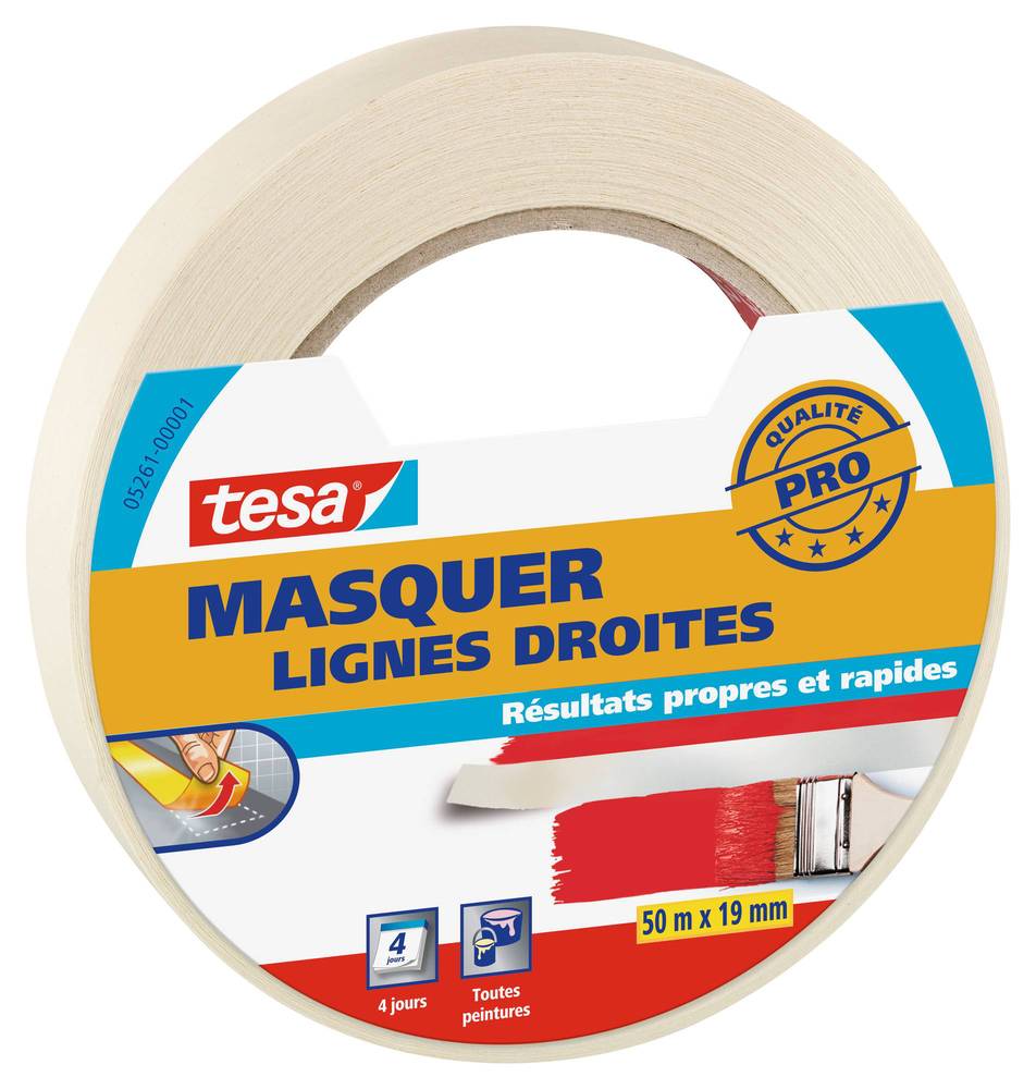 TESA MASQUER LIGNES DROITES 50X19 Bon pouvoir adhésif sur la plupart des surfaces. | Se retire sans laisser de trace pendant 4 jours. | Sans solvant.