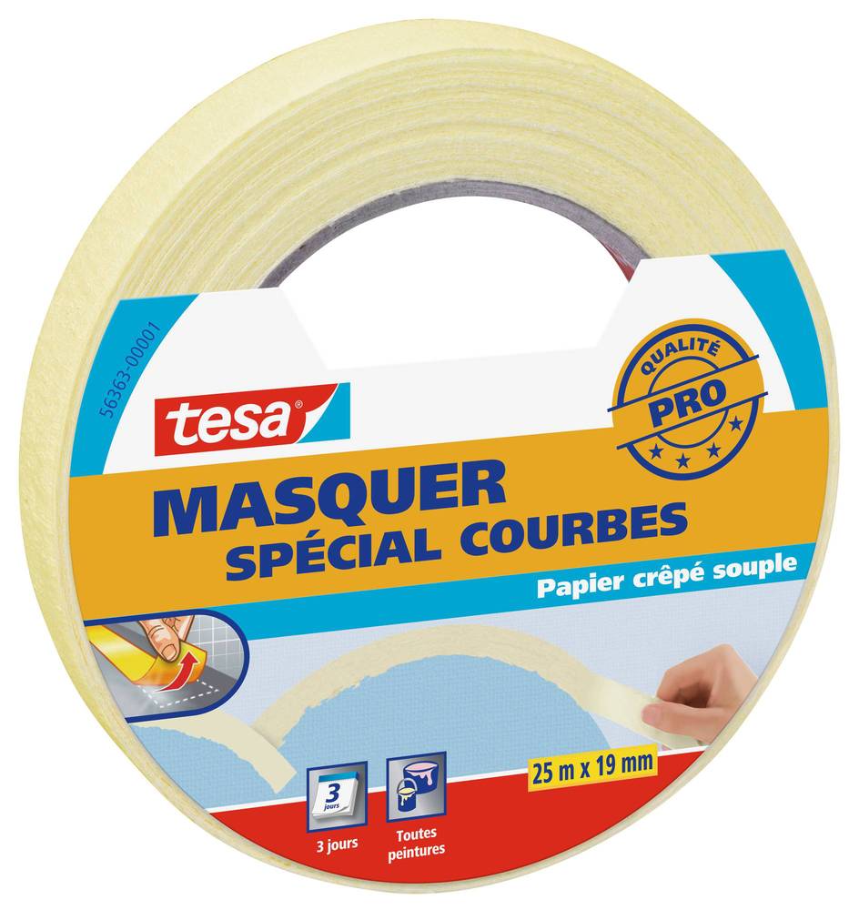 TESA MASQUER PROTECTON COURBE25X19 Adhésif de masquage particulièrement souple pour les formes irrégulières et les courbes sur surfaces lisses et rugueuses.
