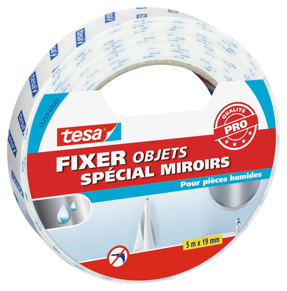 TESA FIXER OBJET DBL F MIROIR 5X19 Ruban adhésif spécial miroirs pour pièces humides. | Fixe solidement au mur simplement et sans percer. | Peut soutenir des miroirs de maximum 70×70 cm et jusqu’à 4mm d’épaisseur.