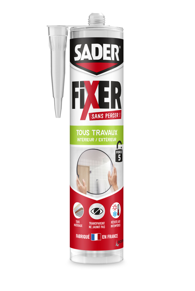 FSP TOUS TRAVAUX TRANSP. CART. 300G La colle de fixation Sader Fixer Sans Percer offre une solution pratique et durable pour tous vos travaux de fixation intérieur comme extérieur. | Sa formule transparente résiste aux intempéries et peut être peinte selon vos besoins. Fabriquée en France, elle est disponible en format cartouche, résistant à des températures allant de -30°C à +90°C. | Cette colle permet de fixer facilement et solidement des patères, des étagères, des appliques, des cadres, des miroirs, des crédences et des prises électriques sur tous types de matériaux. Elle convient particulièrement pour l’assemblage de plastiques sur des surfaces planes.