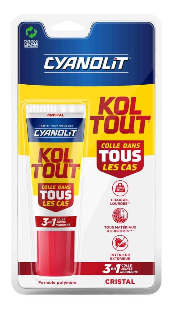 KOLTOUT 3EN1 CRISTAL BLISTER 50ML Colle polymère 3-en-1 transparente permettant de fixer, jointer et reboucher efficacement sur la plupart des matériaux. | Invisible une fois sèche, elle garantit une finition propre et durable, même sur supports humides. | Elle offre une excellente tenue mécanique, supportant jusquà 300 kg/10 cm² selon les conditions dapplication. | Résistante aux chocs, vibrations, flexions et températures extrêmes, elle sadapte aux environnements exigeants. | Elle peut être utilisée en intérieur comme en extérieur, sans solvant, sans acide acétique ni odeur. | Prête à manipuler en 30 minutes, elle est sèche à cur sous 12 à 48 heures selon lépaisseur et les supports. | Elle peut être recouverte dune peinture acrylique dans les 72 heures.