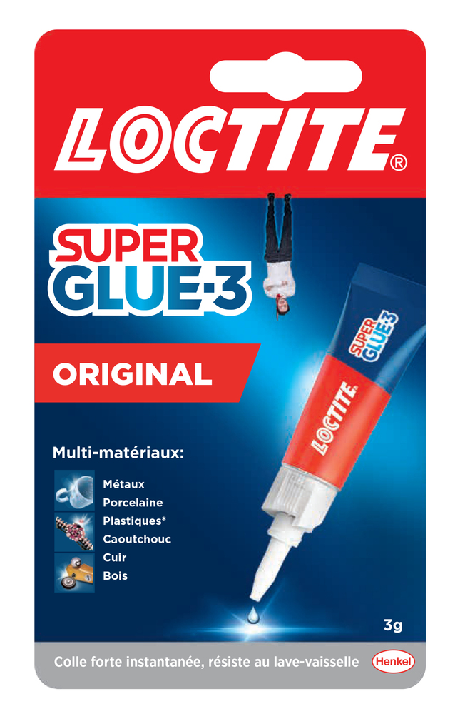 SUPERGLUE-3 UNIVERSAL BLISTER 3GR Colle glue instantanée super puissante formule résiste à l’eau et au lave-vaisselle. | Pour les réparations courantes de la plupart des matériaux. | Supporte jusqu’à 270 kg/cm cube (résistance constatée pour des collages de métal sur métal) | Bouchon anti séchage.