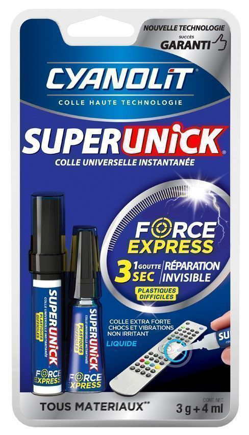 SUPERUNICK EXPRESS PLASTIC LIQ 3G Colle universelle instantanée pour collages puissants et rapides sur tous types de matériaux. | Extra forte : 200Kg/cm2. | Chocs et vibrations, non irritant. | Résiste à leau et au lave-vaisselle. | Transparente. | Spéciale plastiques difficiles.