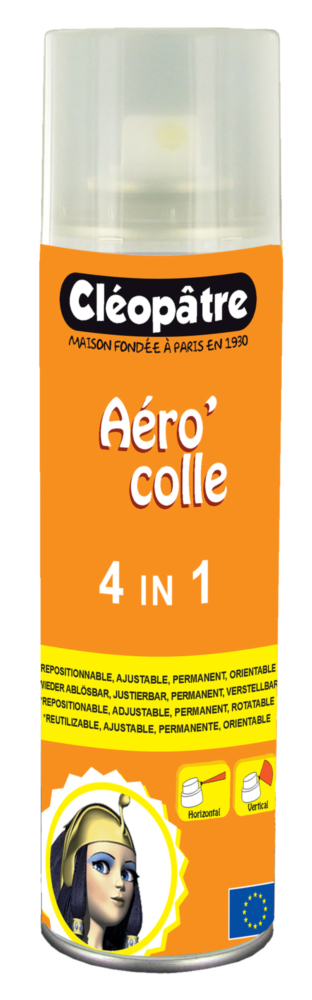 CLEOPATRE AEROCOL 4 EN 1 250ML Aéro’colle colle proprement et instantanément tout type de supports légers (papier, papier épais, carton, carton plume,balsa, etc.) | Buses orientables. | Odeur de colle agréable. | Repositionnable, ajustable, permanente et orientable.