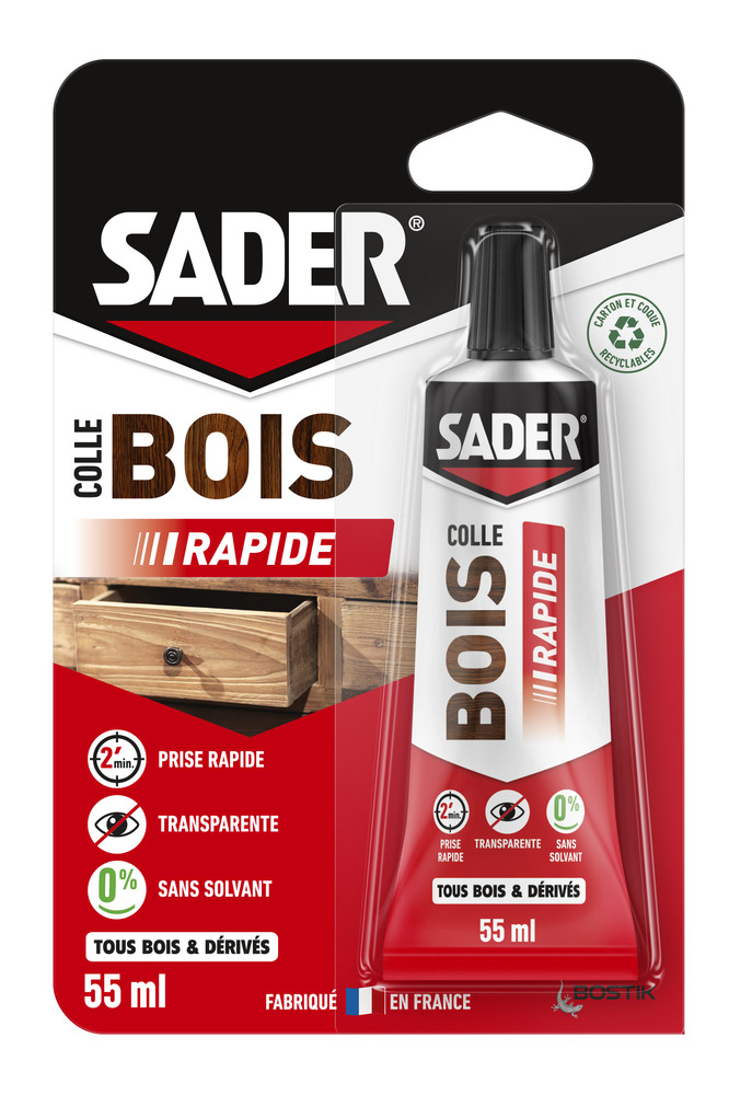 SADER BOIS RAPIDE 55ML BLIST Colle à bois vinylique à prise rapide pour l’assemblage et le placage de tous les bois et leurs dérivés.