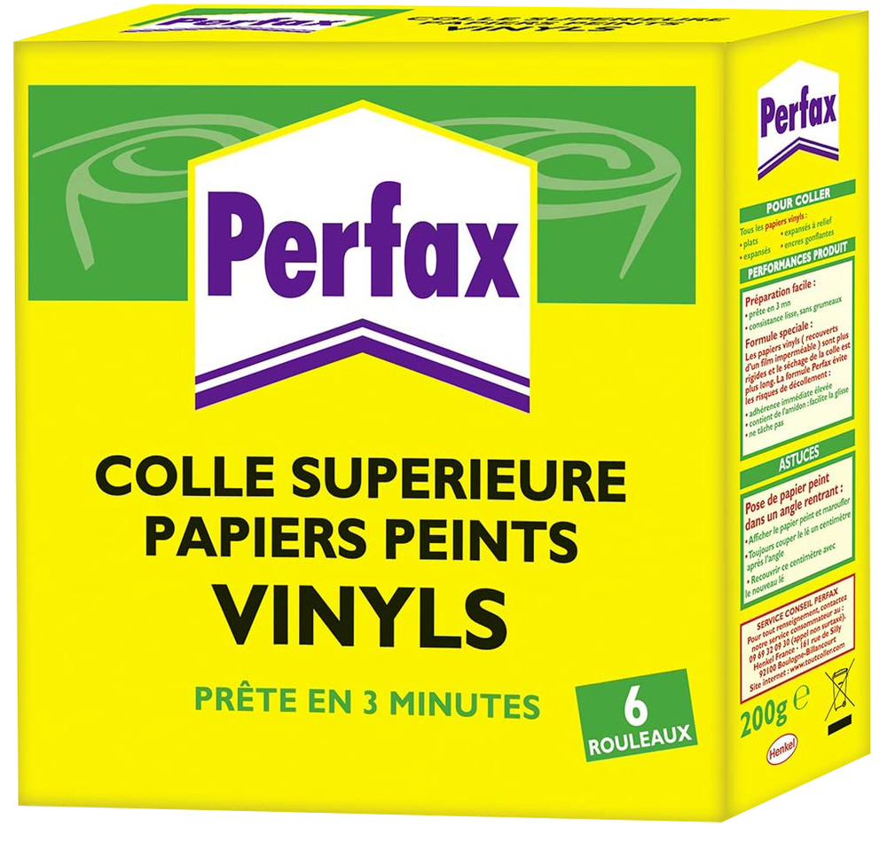 PERFAX COLLE PP VINYLS 200GR Tous types de papiers vinyls (plats, expansés, expansés à relief, encres gonflantes) sur tous types de fonds normalement absorbants en pièces sèches. | Prête en trois minutes. – Sans grumeaux.