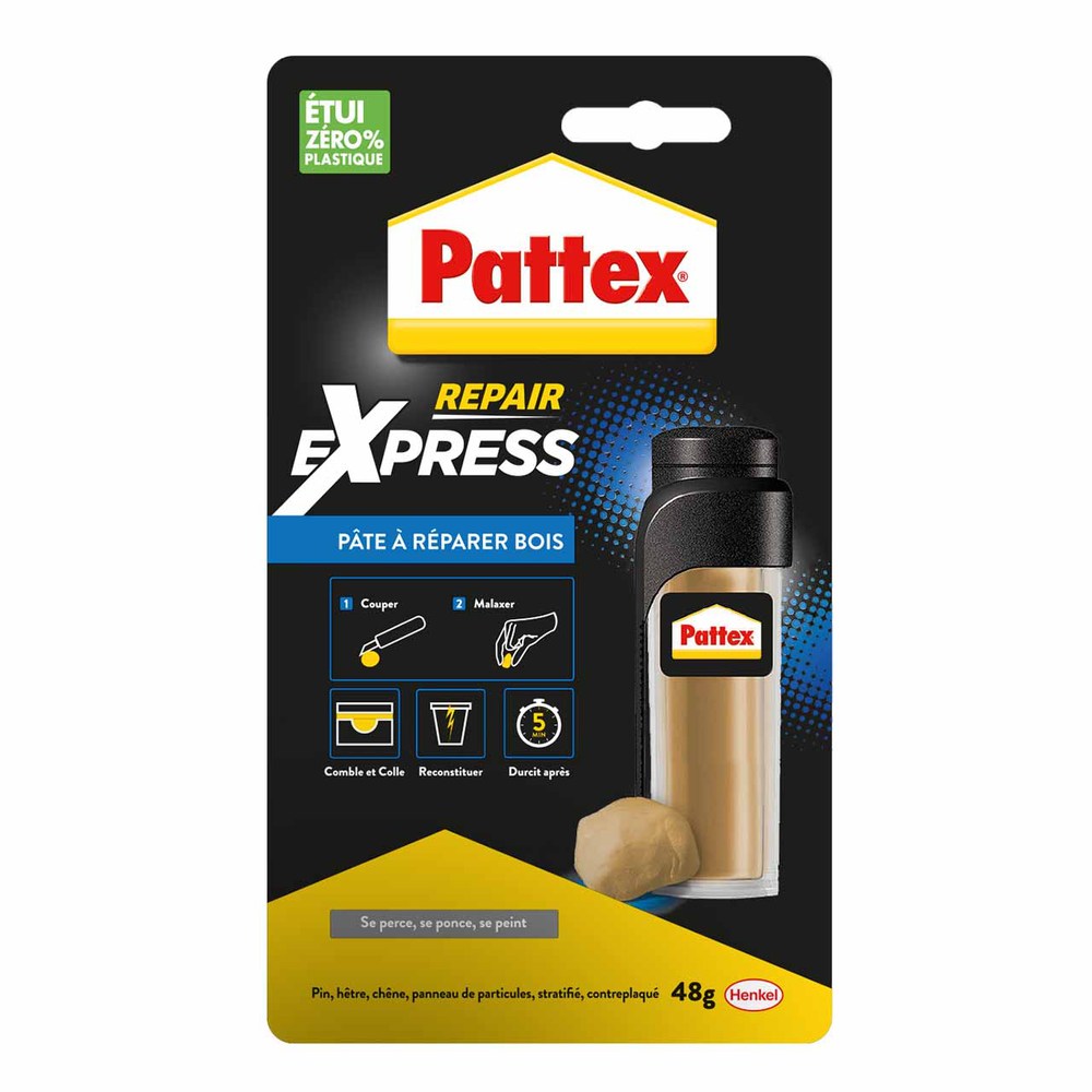 PATTEX PATE A REPARER BOIS 48 GR Repair Express Bois est une pâte à réparer nouvelle formule couleur bois. Elle reconstitue, assemble et rebouche les matériaux en bois. | Extra forte et extra dure, elle résiste parfaitement à l’eau même en immersion. Elle résiste aussi aux températures extrêmes (-30°C/+120°C). Le résultat est parfait. Elle peut se peindre, se poncer et même se percer. Malaxez, appliquez, c’est réparé !