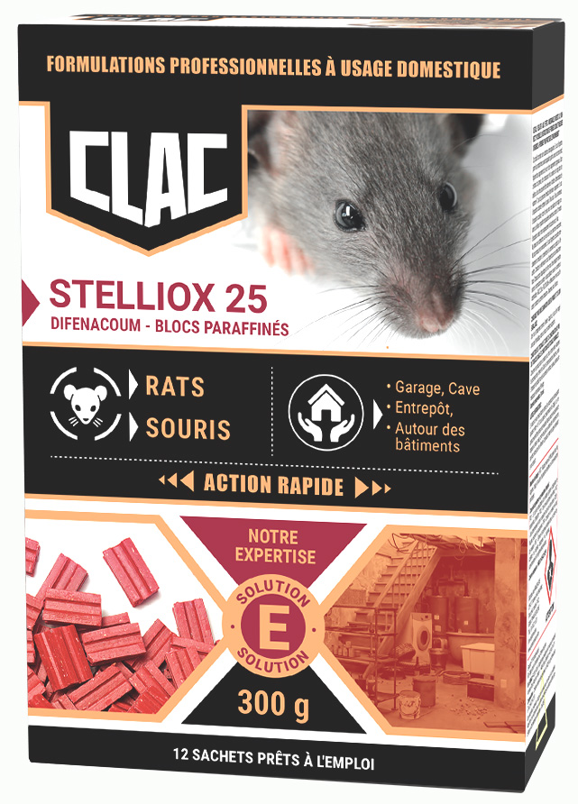 CLAC RATICIDE RATS SOURIS BLOCS150G Raticide polyvalent en bloc paraffiné. | Action rapide et efficace. | Idéal pour les milieux humides. | Difénacoum concentration 25ppm. | Blocs emballés de 25 g