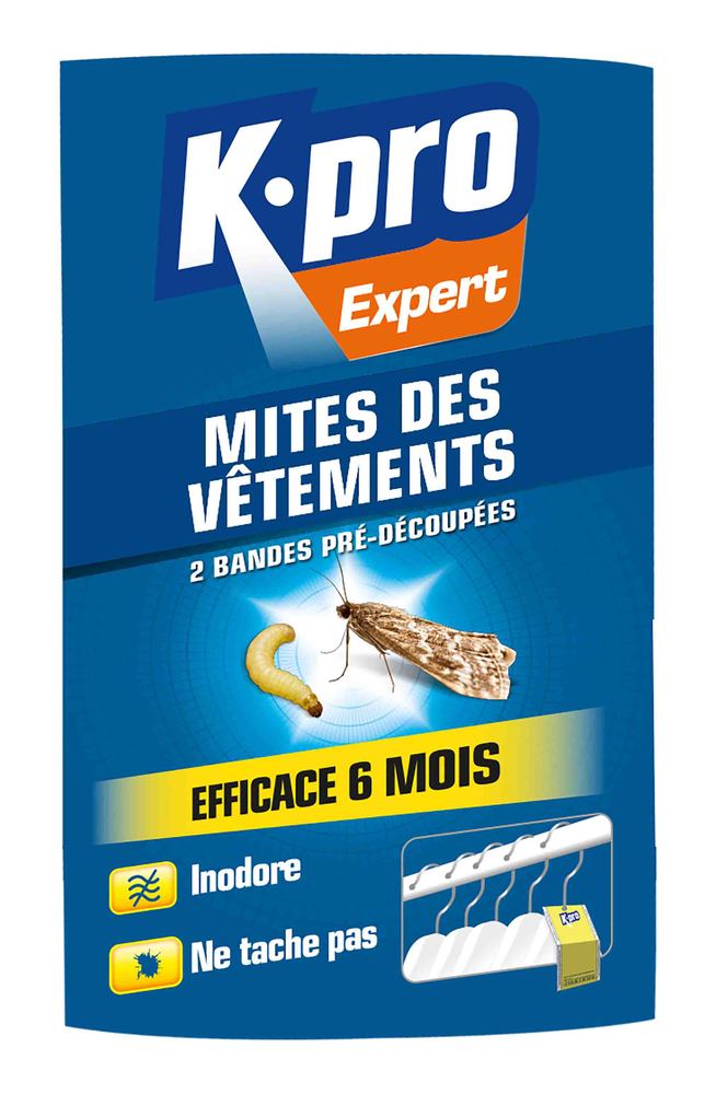 K-PRO EX ANTIMITES VETEMENTS 2BANDE Solution efficace contre les mites des vêtements et leurs larves, ces bandes anti-mites sont conçues pour protéger durablement vos textiles dans les espaces de rangement. | Le format prédécoupé permet une utilisation directe et modulable selon le volume de l’armoire ou du tiroir traité. | Le papier accordéon peut être suspendu dans les penderies ou placé entre les vêtements, dans les tiroirs ou étagères. | Le produit agit sans odeur et ne laisse aucune trace, même sur les tissus délicats. | Son effet curatif et préventif agit immédiatement après application, pour une efficacité pouvant atteindre 6 mois. | Il convient parfaitement aux vêtements en laine, manteaux, couvertures et autres textiles sensibles aux attaques de mites.