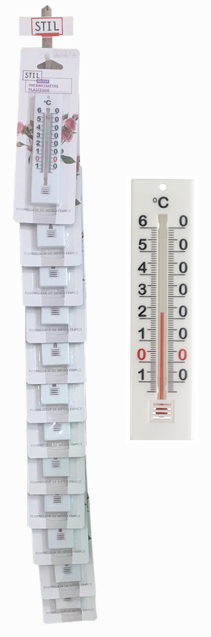 THERMOM+CROSSX12 PTT BLANC PLAST Thermomètre plastique petit modèle pour mesurer la température ambiante intérieur/extérieur. | Dimensions : L139xL34xH7 mm | Poids : 11g