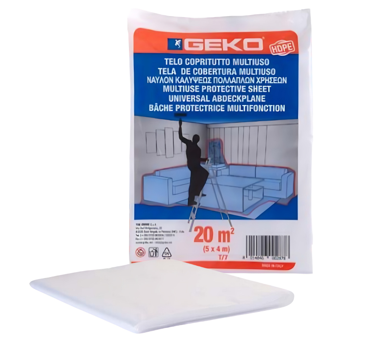 GEKO BACHE PROTECT 20M² SCHT X5 Bâche de protection polyvalente, conçue pour protéger contre la peinture, l’eau, la poussière et l’humidité. | Robuste, réutilisable, économique et écologique. | Elle sert également à protéger le linge contre la pluie, la poussière et la pollution. | Dimensions : 20m² : 5 x 4m