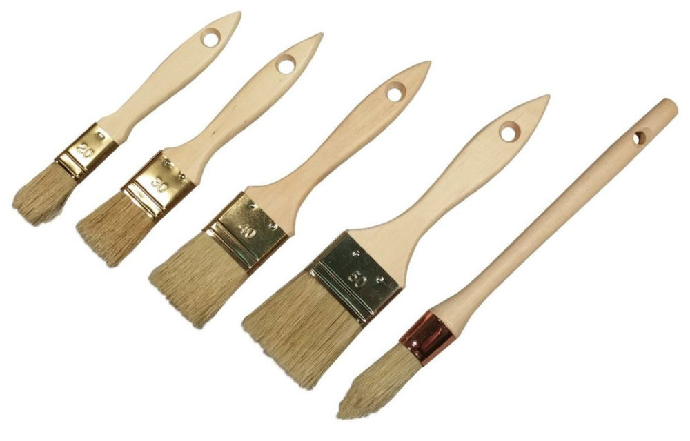 LOT 5 PINCEAUX FSC100% PRO 1 queue à laquer manche bois larg.20 | 1 queue à laquer manche bois larg.30 | 1 queue à laquer manche bois larg.40 | 1 queue à laquer manche bois larg.50 | 1 pinceau à rechampir manche bois N°2 | Présentation sous pochette