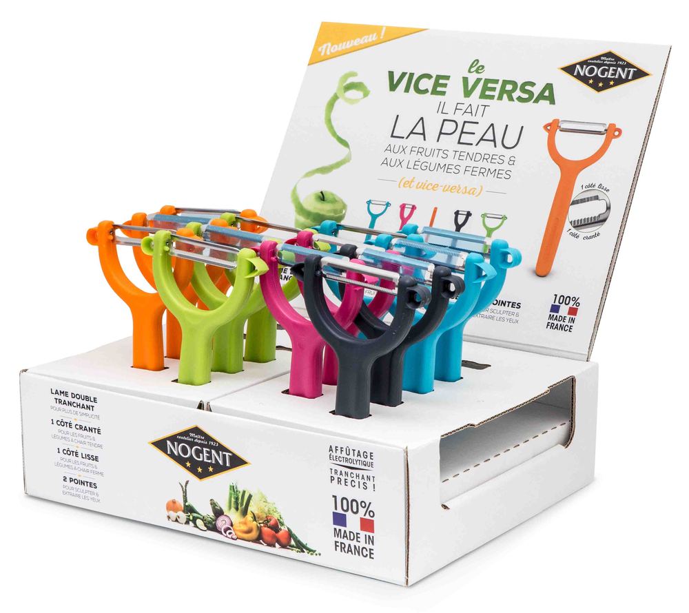 DISPLAY 20 EPLUCHEURS VICE VERSA Innovation pratique pour l’épluchage des fruits tendres comme des légumes fermes. | Avec une lame double tranchant, ces éplucheurs associent un côté cranté pour les peaux fines et délicates, et un côté lisse pour les textures plus dures. | Les deux pointes situées à chaque extrémité de la tête permettent d’extraire facilement les yeux des pommes de terre ou de réaliser des découpes précises. | L’affûtage électrolytique garantit un tranchant précis, durable et performant à chaque utilisation. | Leur conception ergonomique assure une bonne prise en main, quelle que soit la main dominante. | Présenté dans un display de 20 unités, ce lot panaché de 5 coloris convient pour les rayons de cuisine ou les ventes en libre-service. | Fabriqués en France, ces ustensiles respectent les standards de qualité et de durabilité exigés par les professionnels.