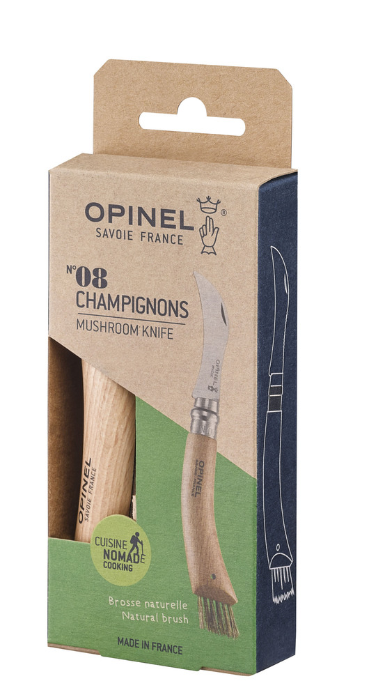 OPINEL BLISTER COUT CHAMPI N°8 Couteau Opinel à Champignon N°8. | L’outil préféré des ramasseurs de champignons ! | Manche en chêne. | Brosse en soies de sanglier. | Lame courbée et dentée en acier inoxydable 8 cm pour faciliter la coupe.. | Bague de sécurité.