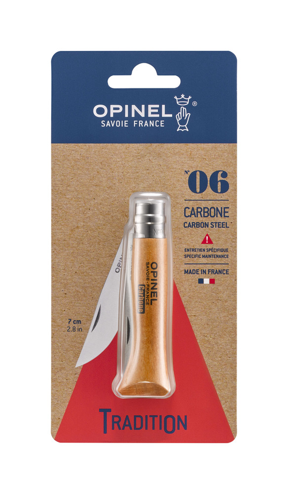 OPINEL BLISTER N°6 CARBONE Couteau Opinel Tradition. | Manche en bois verni, lame en acier carbone. | Bien sécher la lame après usage. | Facile à réaffûter. | Bague tournante double sécurité Virobloc. | Made in France.