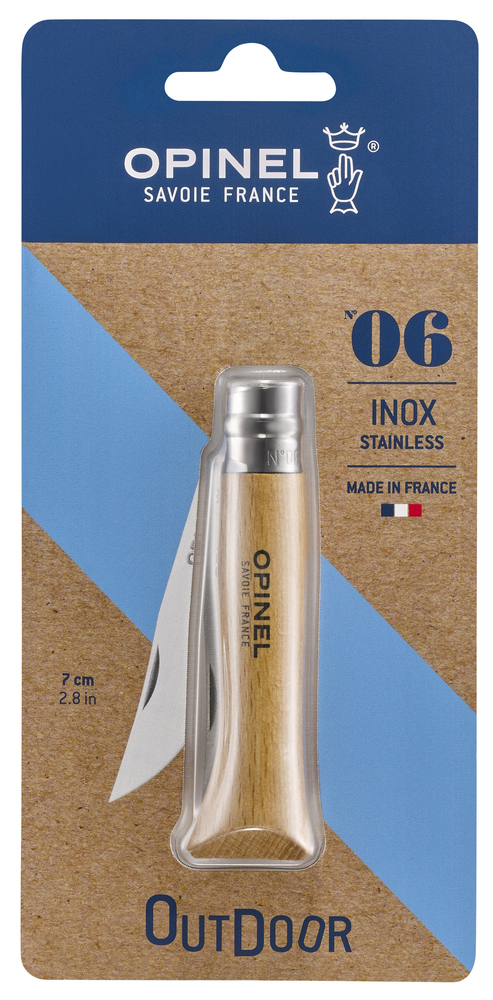 OPINEL BLISTER N°6 INOX Lame en acier inoxydable. | Bague inox double sécurité. | Manche en hêtre vernis naturel.