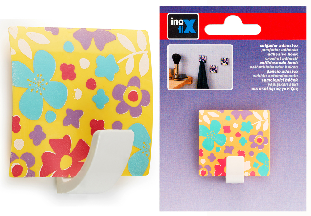 CROCHET ADHESIF DECOR FLEURI JAUNE Support carré adhésif. | Fixation à vis optionnelle (vis non fournies). | Dim. : 42x40x25 mm | Sous blister.