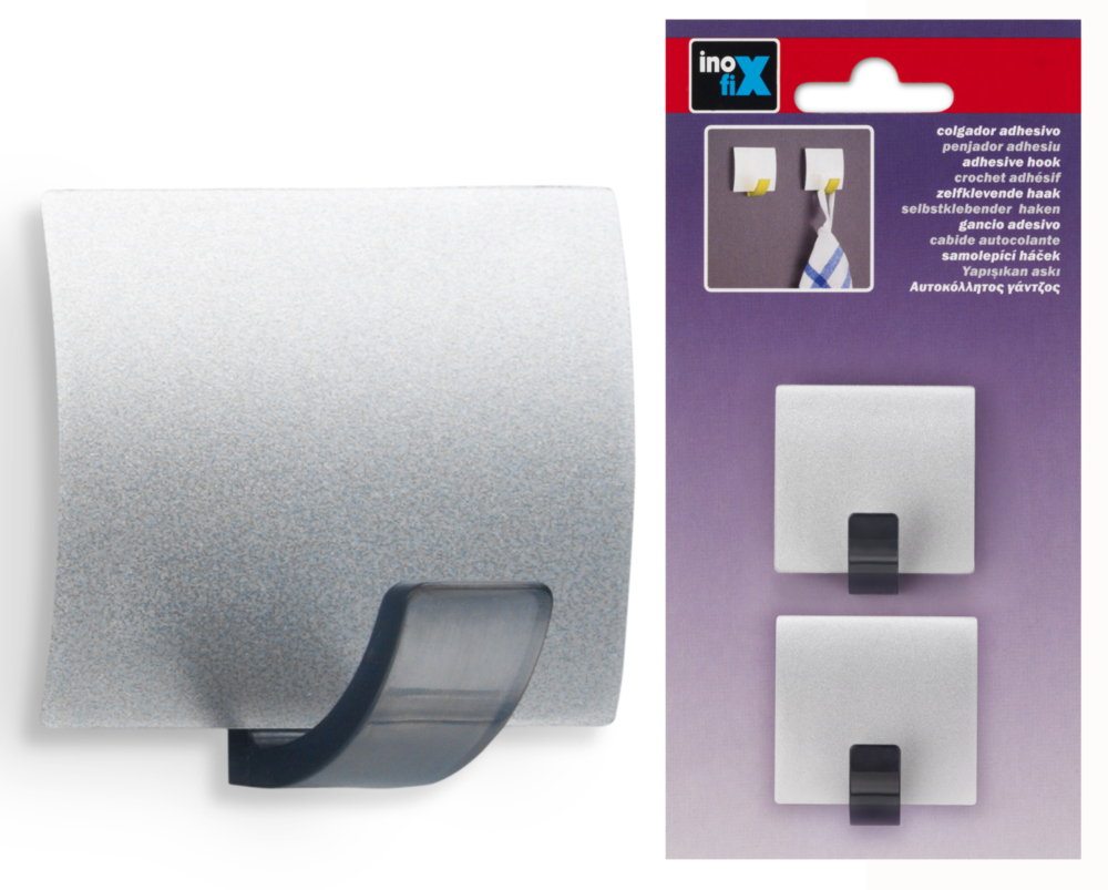 CROCHET ADHESIFX2 CHROME MAT Support carré adhésif. | Fixation à vis optionnelle (vis non fournies). | Dim. : 42x40x25 mm | Sous blister.