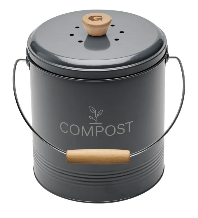 SEAU À COMPOST ROND 4,5L ANTHRA Avec son filtre à charbon intégré, ce seau à compost neutralise efficacement les mauvaises odeurs tout en assurant une bonne aération grâce aux ouvertures situées sur le couvercle. | Le seau intérieur en plastique de 3L facilite la collecte et le transport des biodéchets vers un composteur individuel ou collectif. | Sa poignée ergonomique en bois assure une prise en main confortable pour un usage pratique au quotidien. | Conçu en acier peint résistant, il est facile à nettoyer avec une simple éponge. | Finition gris mat, il sintègre discrètement à tous les styles de cuisines tout en renforçant une démarche durable.