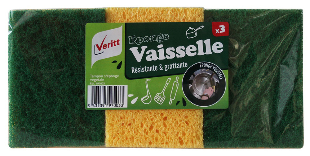 3 TAMPONS S/EPONGE VEGETALE VERITT Tampon à récurer sur éponge végétale. | Résistante et grattante. | Dimension : 98x70x26mm | | Eponge double face permettant à la fois de récurer (côté fibre verte) et de nettoyer (éponge végétale). Utiliser avec de l’eau savonneuse. | Grande capacité d’absorption et grande résistance au déchirement