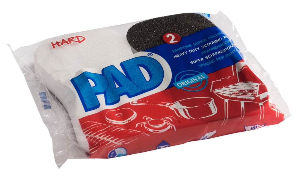 TAMPONS PAD ERGONOMIQUE X2 Récure d’un côté, éponge de l’autre. | Très résistant, ne raye pas et ne rouille pas. | Ergonomique = meilleur prise en main. | Dim. : 70x70x17mm