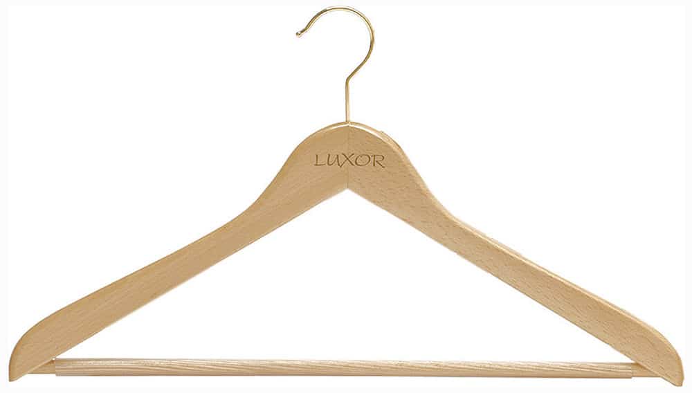 CINTRE BOIS LUX SERGENT NAT 41CM Porte manteau avec barre indépendante. | Bois naturel verni. | Crochet métal jaune tournant.