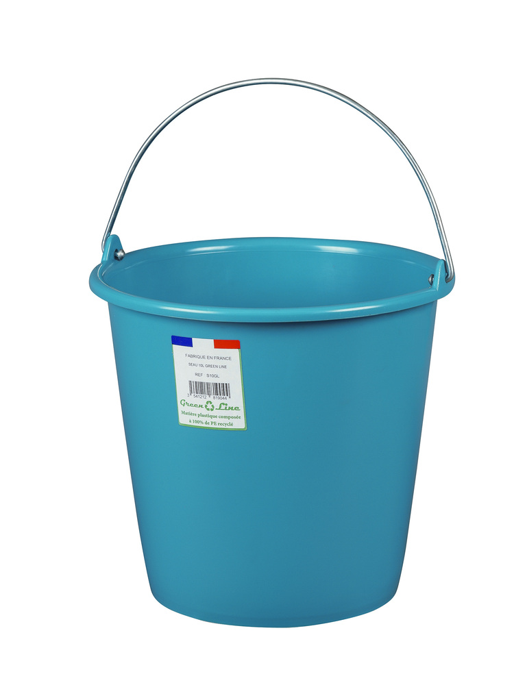 SEAU MENAGE BLEU 10L Seau polyéthylène de la gamme Green Line de chez Aluminium et Plastiques. Il est en polyéthylène basse densité linéaire recyclé 100%, avec anse en acier galvanisé. | Diamètre inférieur 20cm, supérieur 28cm. Hauteur 26cm. Contenance 10 litres.