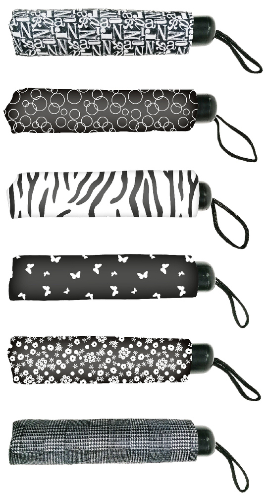 PARAPLUIE MINI TOPLESS DAME IMPRIME Type de parapluie pliant 3 sections avec étui de couleur unie noire. Ouverture manuelle. 8 baleines. | Couleurs assortis.