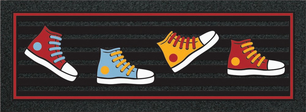 FORMAT CLASSIC SNEAKERS 25X68 La base du tapis Format Classic est réalisé en caoutchouc recyclé, issu du broyage de | pneumatiques usagés. | Cette structure le rend écologique, antidérapant, résistant à l’usure et aux changements de conditions climatique et facile à nettoyer. | Motif Sneakers : Baskets