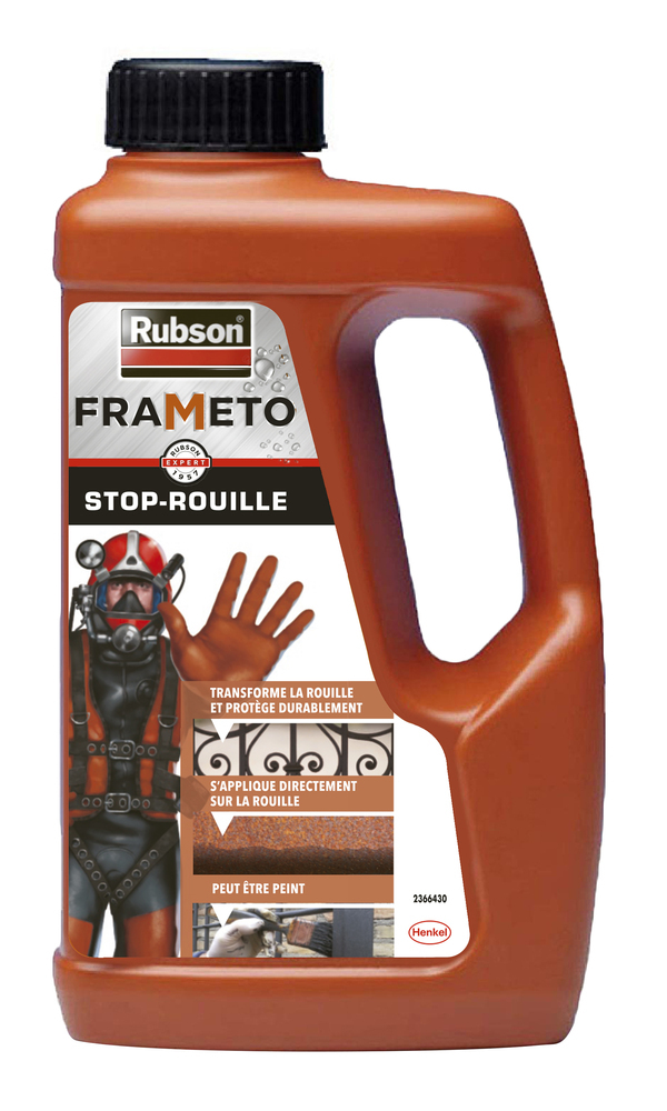 FRAMETO ANT ROUIL 1L 788859 Le Rubson Frameto Stop Rouille est un traitement antirouille qui s’utilise pour le traitement des métaux ferreux. | Il stoppe la rouille et protège durablement le mobilier de jardin, portails, grilles, appareils électroménagers… | Il s’applique directement sur la rouille et peut être peint. | Agit rapidement. | Frameto Stop rouille ne contient pas de plomb.