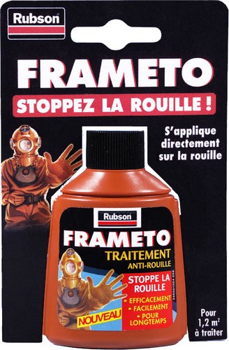 FRAMETO ANT ROUIL 90ML 805678 Stoppez la rouille ! | Traitement anti-rouille des métaux ferreux, il s’applique directement sur la rouille, la transforme et protège durablement le mobilier de jardin, portails, grilles … | Frameto Stop-Rouille agit rapidement et peut être peint. | Ne contient pas de plomb.
