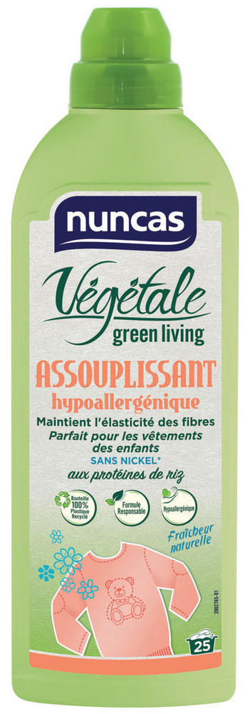 VEGETALE ASSOUPLISSANT 750ML Assouplissant hypoallergénique dorigine naturelle, rend les vêtements doux, naturellement parfumés. | Maintien l’elasticité des fibres. | – Sans colorants ni conservateurs. | – Enrichi en protéines de riz, aux propriétés émollientes et adoucissantes. | Fraicheur naturelle. | Sans nickel.