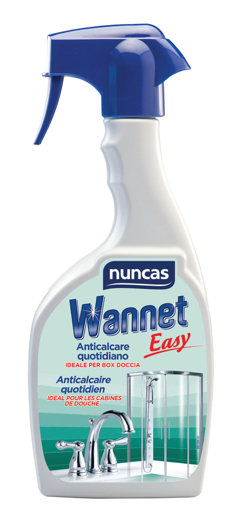 WANNET EASY ANTICALCAIRE 500ML Wannet Easy est un détergent anticalcaire délicat pour lentretien quotidien de la cabine de douche et des baignoires à hydro-massage. Sa formule qui nest pas agressive est étudié exprès pour faire briller immédiatement même les surfaces les plus délicates, comme la vitro-résine et les poly-carboxylates. | Son action nettoyante et son doux parfum de chèvrefeuille génèrent une sensation de fraîcheur et de bien-être. | Sa consistance visqueuse le fait adhérer parfaitement aux parois et lui permet de dissoudre de façon efficace les résidus de savon et de calcaire. Utilisé régulièrement sur lacier et sur les surfaces chromées, il en exalte la brillance et prévient les dépolissages et les points de corrosion.