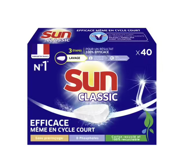 SUN LAVAGE STD X40 DOSES CLASSIC Les tablettes pour lave-vaisselle SUN nettoient parfaitement la vaisselle, même en cycle court. | Sans prérinçage, 0 phosphates.