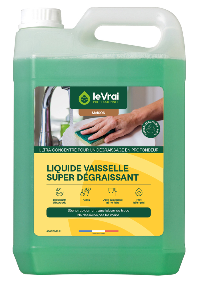 LE VRAI MAISON LIQUID VAISSELLE 5L Liquide vaisselle Le Vrai Maison ultra concentrée, idéale pour dégraisser en profondeur pour une brillance parfaite : Idéale pour décoller les salissures incrustées. Facile à rincer sans laisser de trace. Ne dessèche pas les mains. Senteur fruitée.