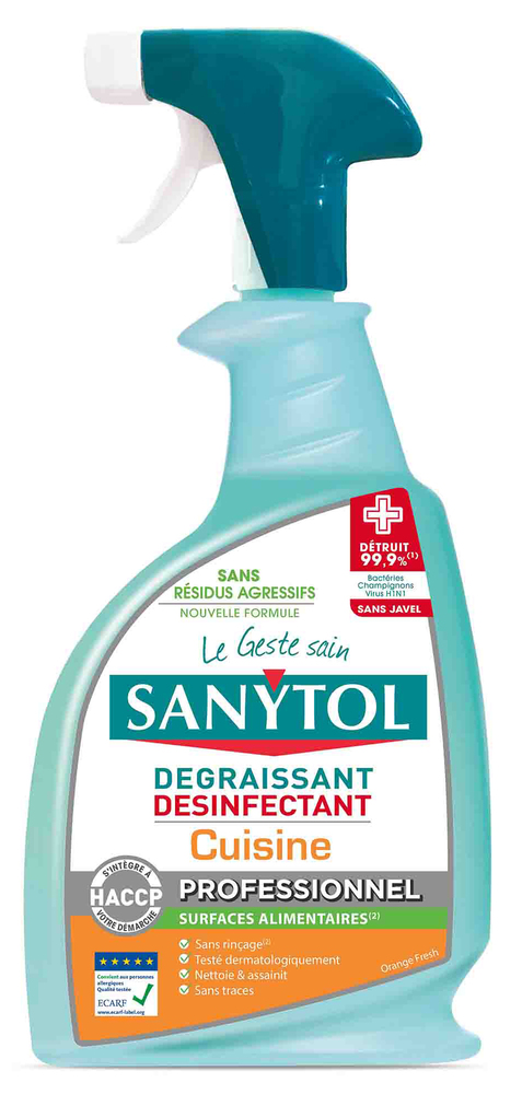 SANYTOL PRO CUISINE ORANGE 750ML Détruit 99,9% bactéries, virus, champignons & virus H1N1 sans javel. | Dissout les graisses incrustées. | S’intègre dans une démarche HACCP. | Adapté aux surfaces alimentaires avec rinçage. | Testé dermatologiquement. | Parfum Orange.